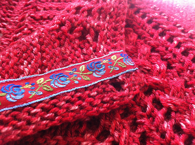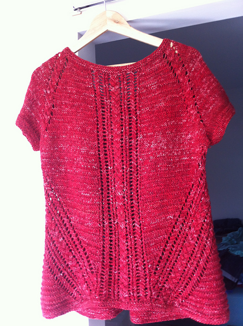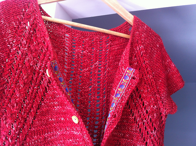 Первый мой опыт был с пряжей Malabrigo Arroyo (300м/100гр), из нее я пыталась связать кардиган с запАхом. Весь мой запАх вытянулся по краю планки неимоверно, где-то сантиметров на 30 вниз, вот фото из архива :) Связано без каких-либо расширений, т.е. предполагалось, что нижний край будет заканчиваться почти прямым углом.